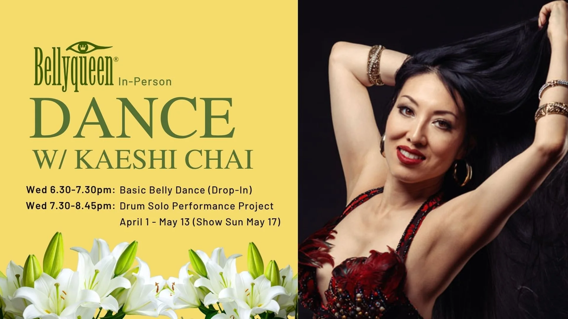 Intermediate belly dance experience welcome. Come ready to sweat, sharpen, and perform!